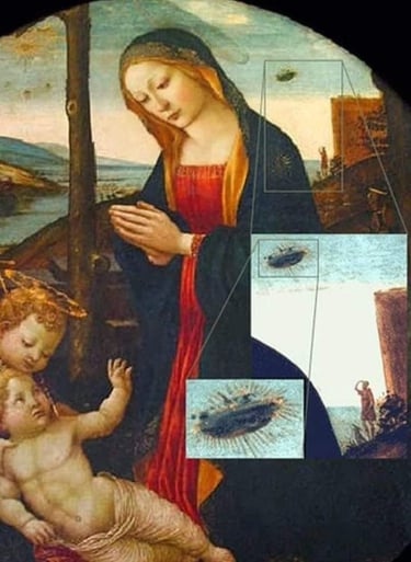 En el siglo XV, el artista Domenico Ghirlandaio pintó La Madonna con San Giovannino, una obra en la que se observa una curiosa figura en el cielo, similar a lo que hoy en día se describiría como un “platillo volador”. La pintura muestra a una mujer con el Niño Jesús, y en el fondo se aprecia un objeto brillante con forma de disco en el cielo, mientras un hombre y su perro parecen observarlo con asombro.