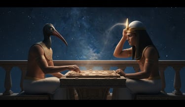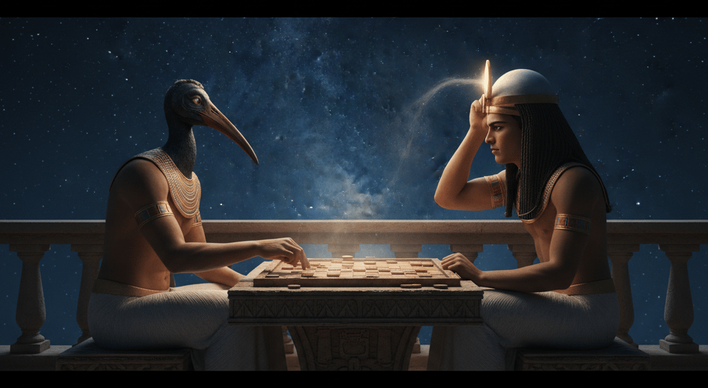 En aquel tiempo, el calendario egipcio constaba de 360 días exactos. La palabra de Ra era ley, y su maldición parecía sellar el destino de Nut, impidiendo que su descendencia viera la luz. El orden cósmico (Maat) necesitaba que esos niños nacieran, pero la voluntad del Sol era inquebrantable. El mundo necesitaba una solución ingeniosa.